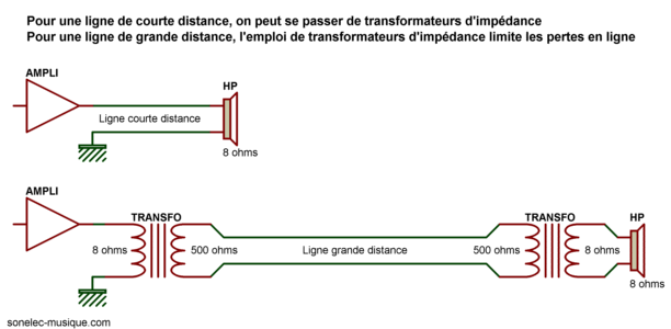 Attention, il ne faut pas s'imaginer que plus l'impédance de la ligne va être élevée et plus la puissance perdue sera faible ! Ce qui doit être retenu est que la puissance perdue est minimale quand on utilise une impédance de départ (secondaire transfo en sortie ampli) et une impédance d'arrivée (primaire transfo sur HP) de même valeur que l'impédance caractéristique de la ligne. Or cette impédance caractéristique est relativement constante dans la bande de fréquences qui nous concerne ici. Elle n'est pas de 10 ohms, ni de 10 kOhms, mais de quelques centaines d'ohms. C'est pourquoi on utilise toujours des transformateurs de ligne dont l'impédance de l'enroulement connecté sur la ligne est voisin de 500 ou 600 ohms (dans la réalité, l'enroulement du transfo n'a pas une impédance de cette valeur, mais il est fait pour travailler avec cette valeur).