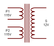 Contrairement aux enroulements à prise intermédiaire, deux enroulements séparés sont totalement isolés entre eux et permettent certains montages qui sont interdits avec les autres. La photo ci-dessous à droite, qui représente un transfo avec deux secondaires de 12 V chacun (ne tenez pas compte de l'indication donnée sur le schéma électronique de gauche, c'est plus pour la forme que pour les valeurs de tension), laisse visiblement apparaître les 4 broches des secondaires (2 x 2) en bas, et les deux broches du primaire en haut. Ce type de transformateur autorise la mise en parallèle des deux secondaires, ce qui permet de doubler la capacité en courant tout en conservant la tension d'un seul secondaire (voir interconnection des enroulements).