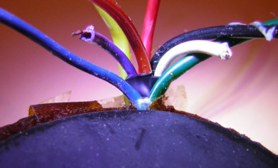 Restons-en avec l'hypothèse que le transformateur en question est un transformateur d'alimentation abaisseur de tension. Dans ce cas, la section (le diamètre) du fil utilisé pour le primaire est plus faible que la section du fil utilisé pour le secondaire. Sur les gros plans des broches du transformateur ci-dessous, on voit nettement la différence (primaire à gauche en fil fin, et secondaire à droite, en fil plus gros).
