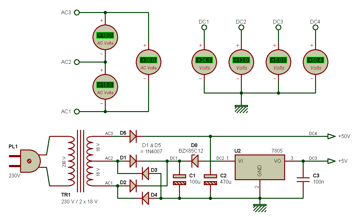Les valeurs de tensions indiquées ci-devant peuvent varier un peu (+/-10%), en fonction du transformateur utilisé et de la tension secteur appliquée sur son enroulement primaire. Sur mon prototype, j'ai mesuré, j'ai mesuré 51 V sur la ligne "50 V", un poil plus que la tension nominale de 50 V du condensateur que j'ai utilisé (je conseille un modèle 63 V).