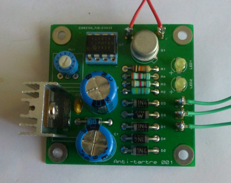15/11/2015 : Après une bonne semaine de fonctionnement, je dois dire, avec le peu de recul que j'ai pour l'instant, que c'est efficace. Les parois vitrées de la douche restent propres et sans traces lors du séchage. La bouilloire électrique, qui avait été détartrée le jour de la mise en service est toujours "propre", il y a bien quelques marques de dépôt mais rien de comparable avec le passé.Merci Michaël pour ces retours. Pour l'échauffement du régulateur 5 V, il est également possible d'insérer une diode Zener de 12 V / 1,3 W en amont (cathode vers pont de diodes et anode vers régulateur, ajouté dans version du 18/02/2018). Comme vous pouvez le constater, Michael a inclus le transfo d'alim sur le circuit imprimé et l'ensemble reste compact.
