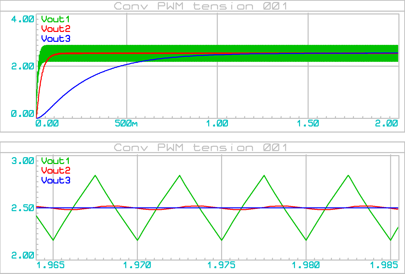 agrandissement graphes)Le schéma ci-devant montre ce qu'on obtient avec un signal PWM de 100 Hz et trois types de filtre :