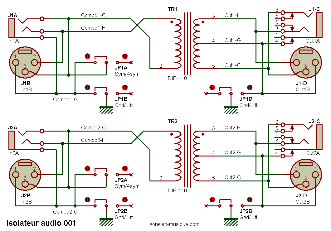 Vu l'usage prévu du circuit, le type de transformateur et son rapport de transformation ne sont théoriquement pas critiques, le principal étant qu'ils assurent l'isolation galvanique. On ne peut toutefois passer sous silence que le rapport de transformation du DIB-110 est de 10:1, contre 1:1 ou 1:2 pour les LTR-110 et TY-250. Notez en outre les différences de branchement des connecteurs de sortie entre le schéma 001 et les schémas 001b et 001c. Sur les schémas 001b (avec transformateurs LTR-110) et 001c (avec transformateurs Triad TY-250), le jack et la XLR de sortie délivrent deux signaux audio isolés. En plus de la fonction isolation, on dispose donc aussi d'une fonction splitter 1E/2S.
