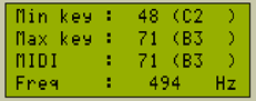Un afficheur LCD alphanumérique et 100% optionnel permet de connaître à tout instant la plage de jeu sélectionnée (de "Min Key" à "Max Key") ainsi que la note actuellement jouée (valeur de hauteur "pitch" transmise sur la sortie MIDI OUT, et fréquence du signal audio).