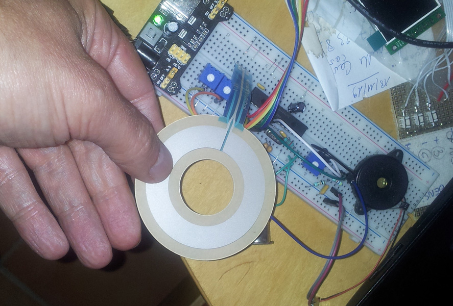 Le fonctionnement n'a pas été immédiat. Des notes justes sortaient en pressant le potentiomètre souple en divers endroits, mais d'étranges sons apparaissaient aussi de manière aléatoire, même quand je ne faisais rien. J'ai vite compris que le potentiomètre souple et long formait une magnifique antenne ! J'ai donc ajouté un filtre passe-bas rudimentaire sur l'entrée ADC du PIC (simple couple résistance + condensateur).