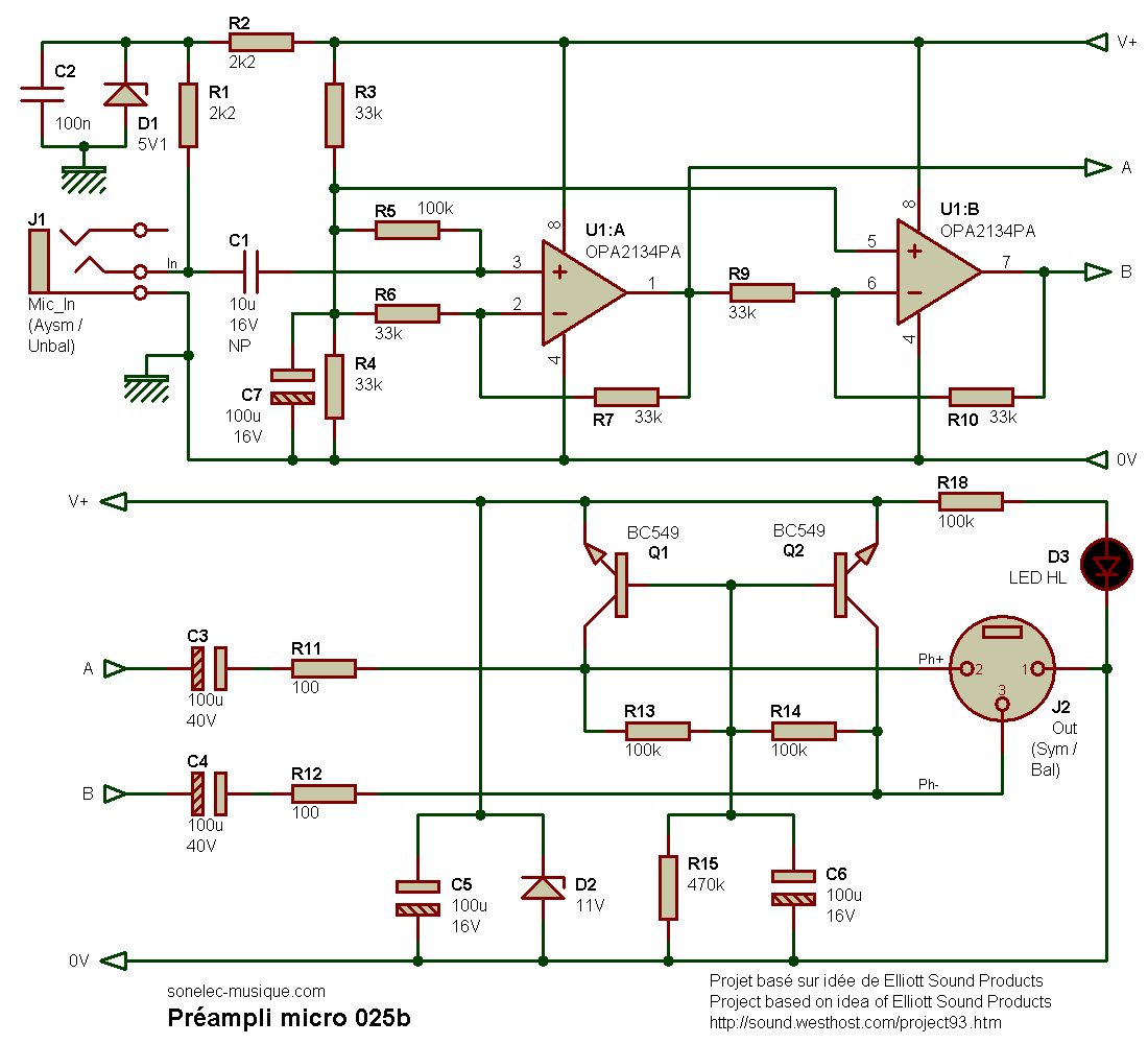 Préampli monophonique pour capsule electret, avec sortie symétrique et