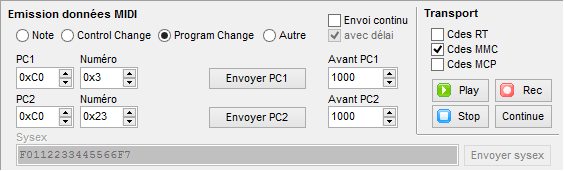 Il est également possible d'envoyer des messages Start, Stop et Continue de type "standard" ou à la norme MMC (MIDI Machine Control).