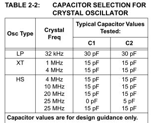 - utiliser le mode oscillateur HS plutôt que le mode XT;Pour la valeur des condensateurs, le même type de recommandation s'applique si on utilise un quartz (crystal dans le texte anglais), voir tableau suivant.